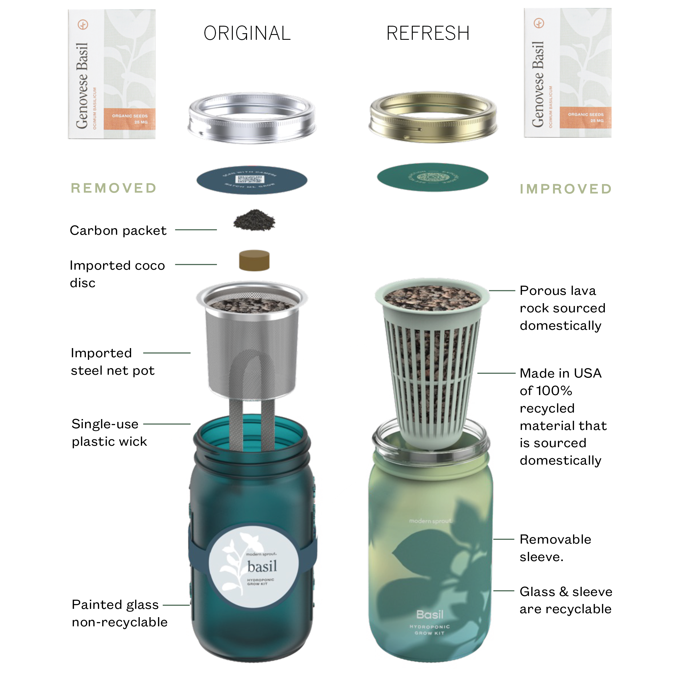 To reduce the product’s carbon foot print and create a product with a longer lifespan, I swapped the steel net pot used in the Garden Jars for a 100% recycled HDPE net pot. The recycled content used for the net pot was recycled and sorted from the USA and the net pot was tooled and manufactured in Minnesota, drastically reducing the carbon footprint of this component.